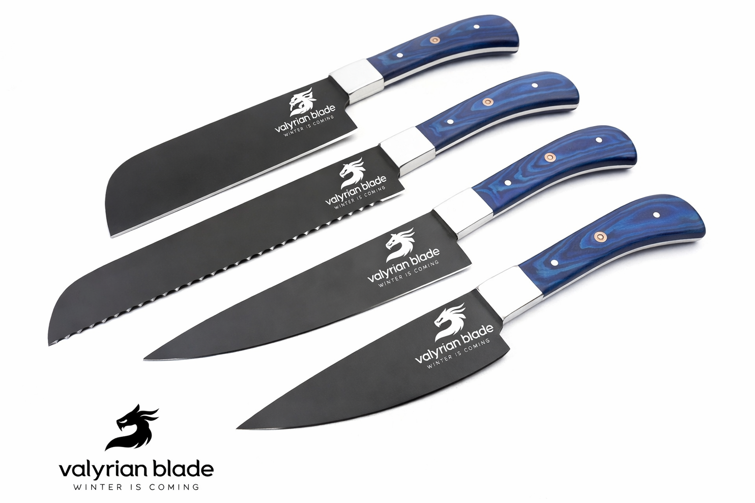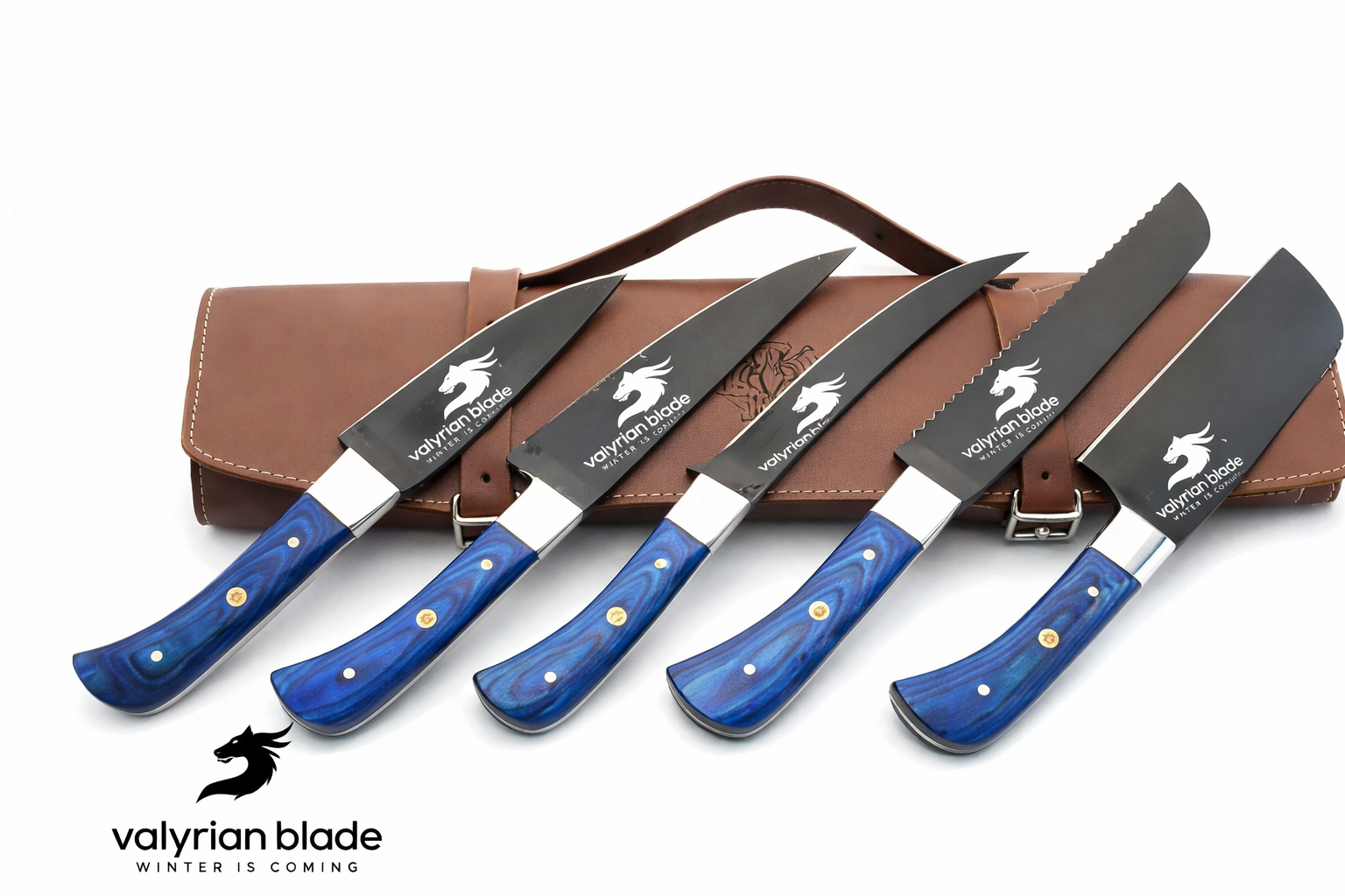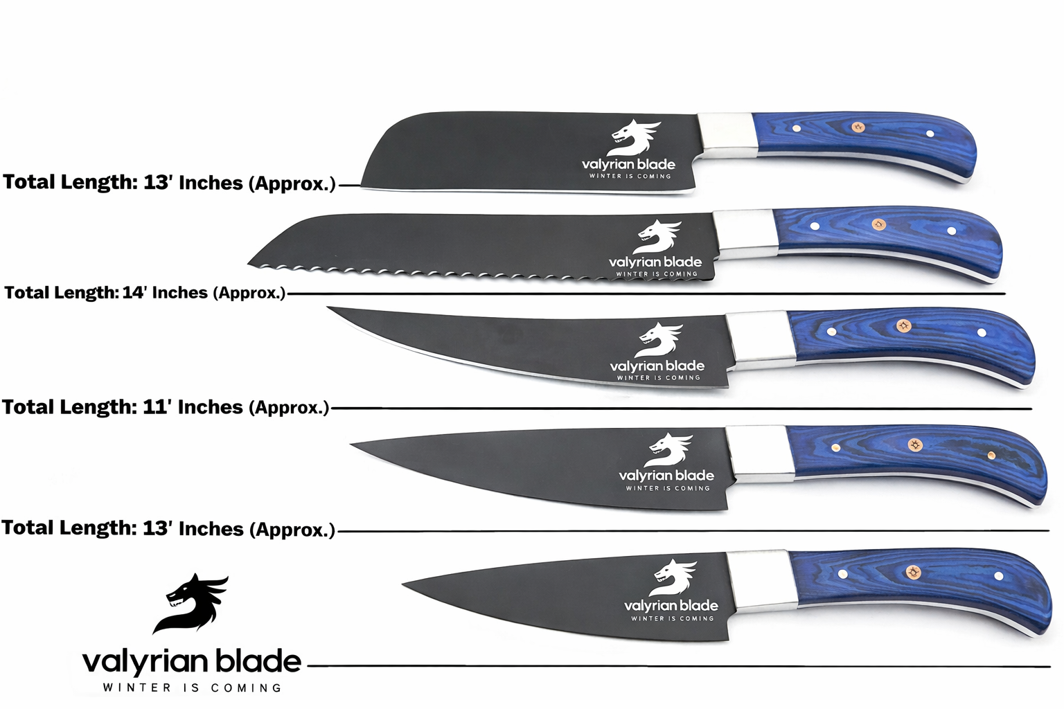 - ✅ VALYRIAN BLADETop rated 5 Kitchen Knife Set SPECIFICATIONS – Handle Material – Rosewood Total Length – 13”, 12”, 11”, 10”, 9.5” (approximately) Blade Length – 8”, 7”, 6” , 5”, 5” (approximately) Handle Length – 5” , each for all 5 Knives (approximately). Blade –> Top quality Handmade Chef Set Knives, highest quality Damascus Blade/D2Steel/Powder Coated is covered with oil and hard wax. Prefect kitchen chef’s knives.