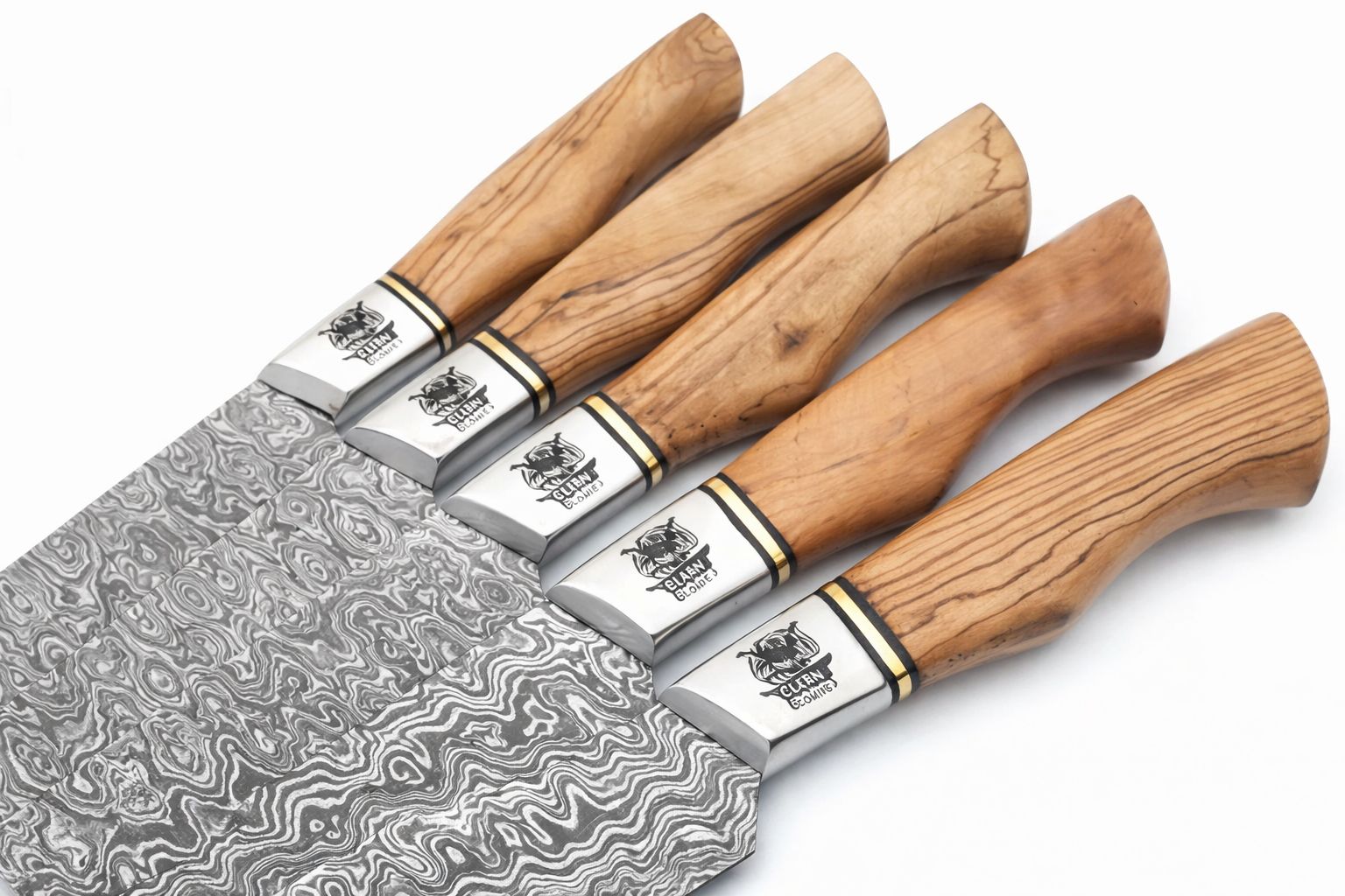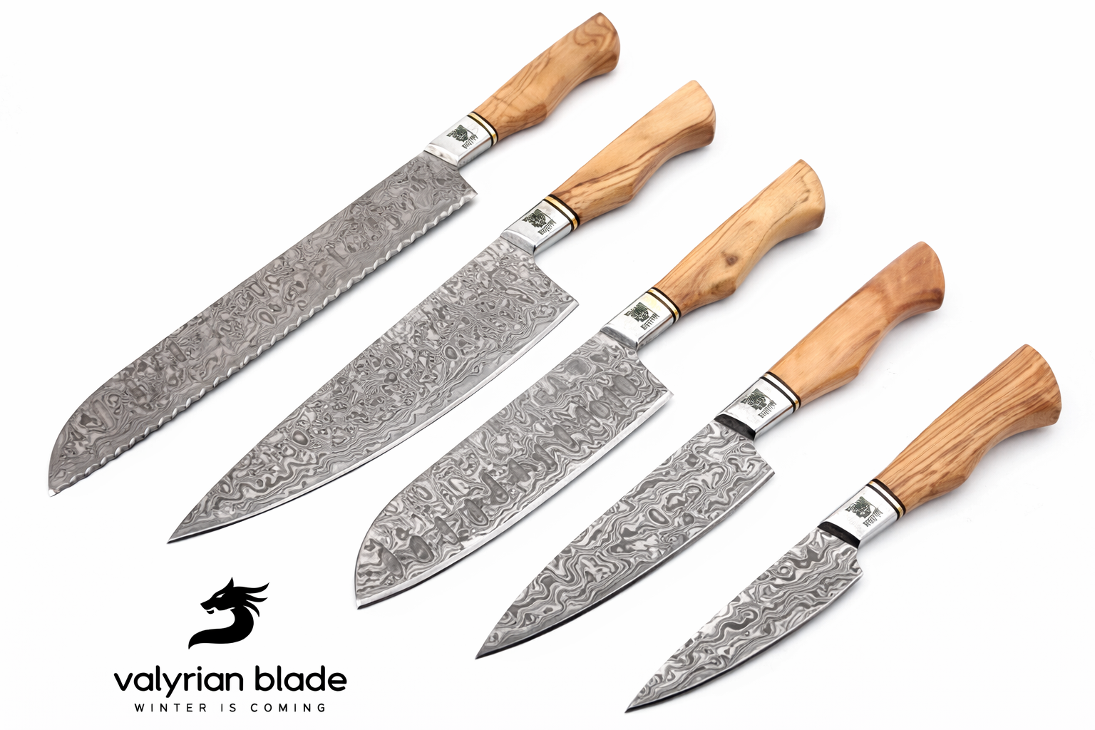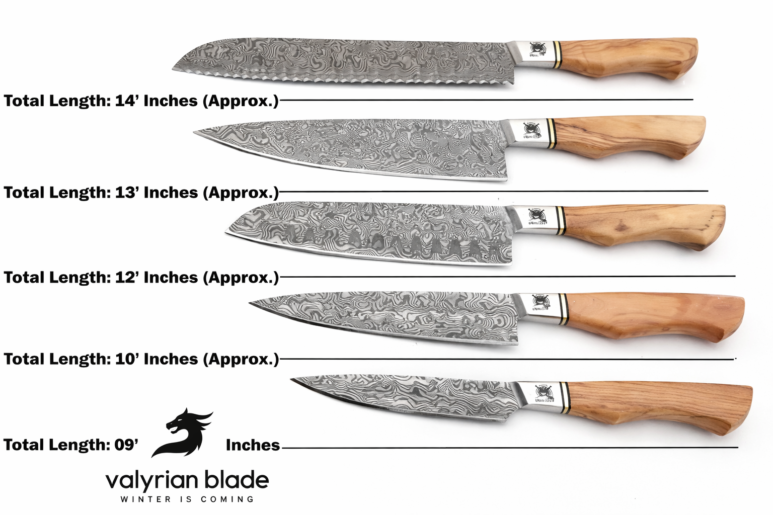 - ✅ VALYRIAN BLADE Top rated 5 Kitchen Knife Set SPECIFICATIONS – Handle Material – Rosewood Total Length – 13”, 12”, 11”, 10”, 9.5” (approximately) Blade Length – 8”, 7”, 6” , 5”, 5” (approximately) Handle Length – 5” , each for all 5 Knives (approximately). Blade –> Top quality Handmade Chef Set Knives, highest quality Damascus Blade/D2Steel/Powder Coated is covered with oil and hard wax. Prefect kitchen chef’s knives.