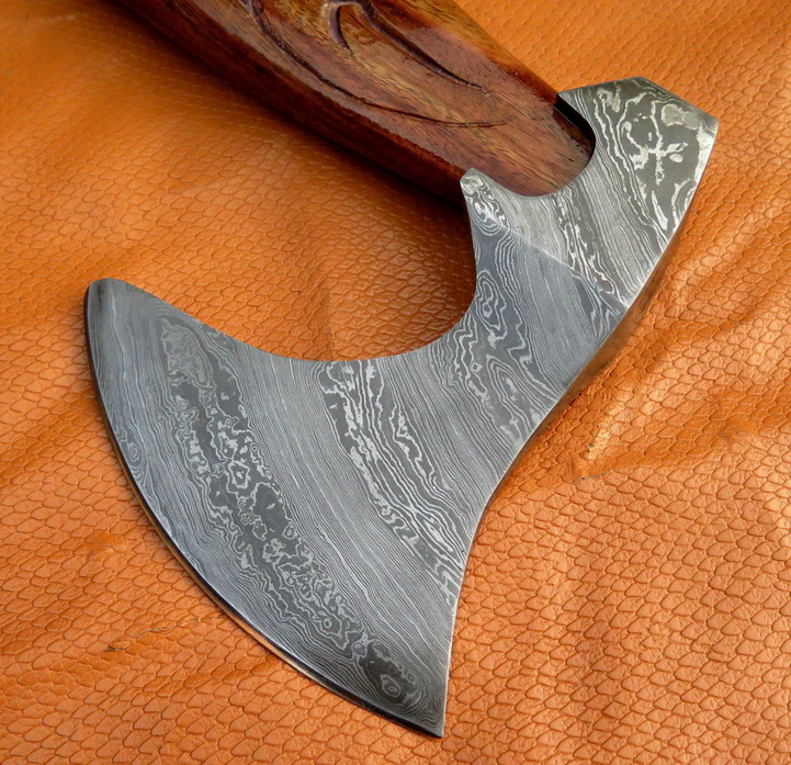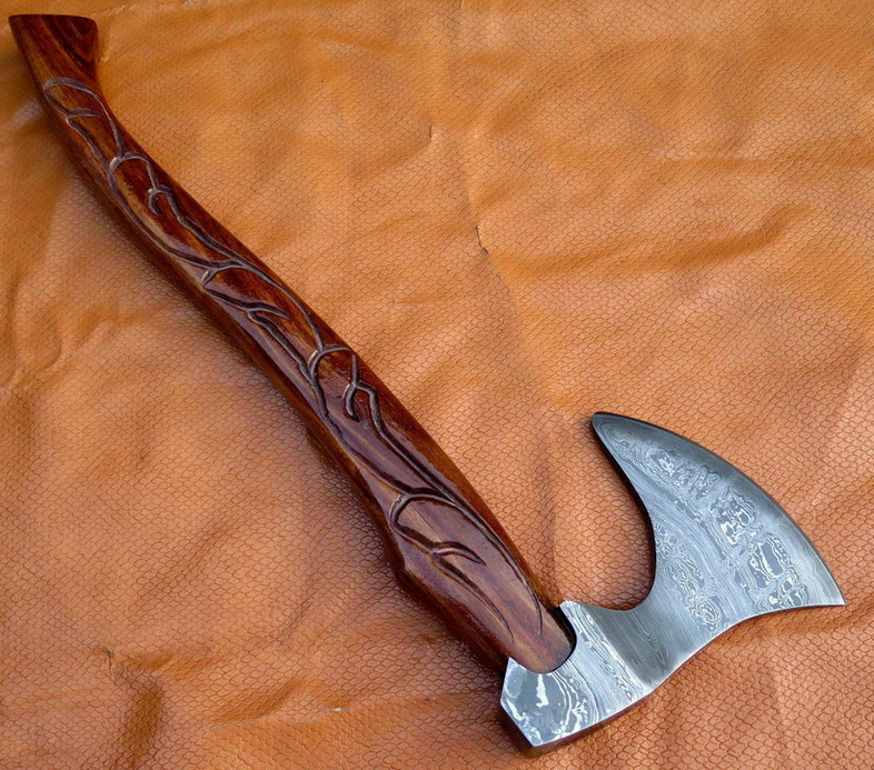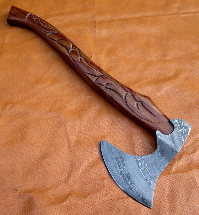HANDMADE CARVED HANDLE DAMASCUS STEEL VIKING AXE WITH SHEATH