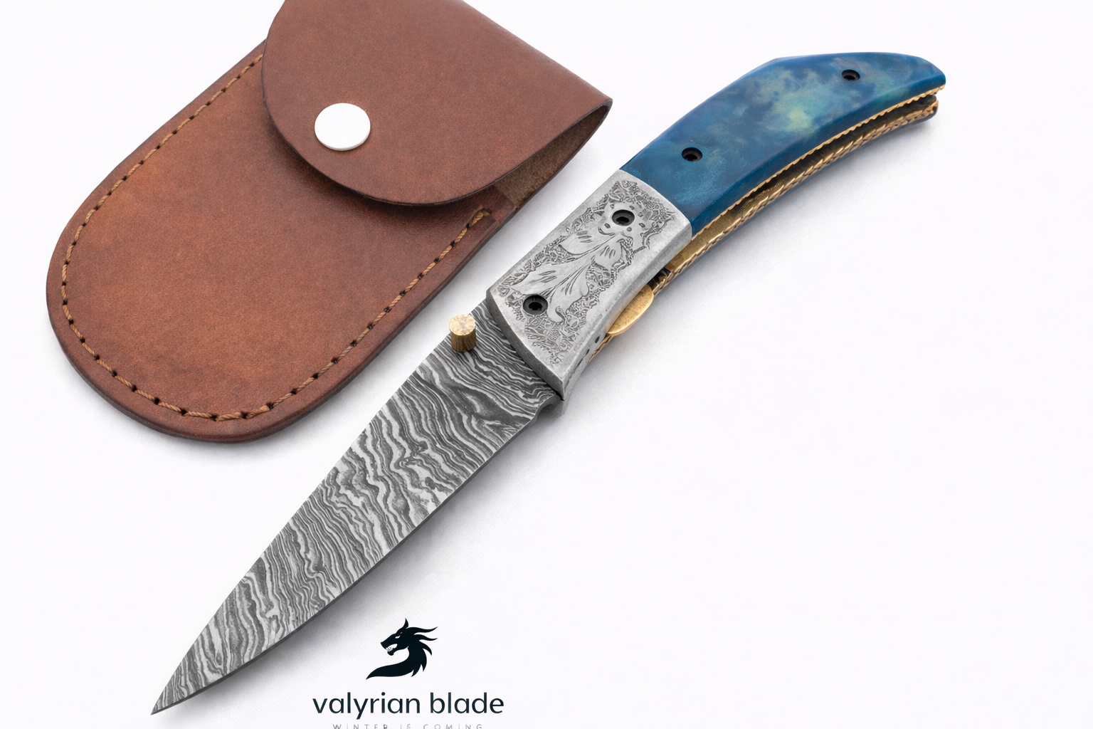 Full Damascus Pocket knife with Damascus Handle & Blade, Folding knife with liner lock, Camping Knife, Hunting knife with Premium Leather Sheath (FK-10) ✅ VALYRIAN BLADE Top rated Folding/Pocket Knife SPECIFICATIONS: Overall Length: 9 Inches (Approximately) ...